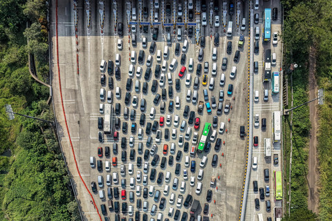Arus mudik Lebaran mulai menunjukkan peningkatan dengan terjadinya kemacetan kendaraan di Gerbang Tol Cikampek, Jawa Barat, pada Selasa (17/3). Foto: Bay Ismoyo / AFP